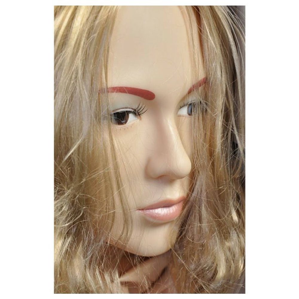 Nafukovací panna vypadá přesvědčivě se svou 3D tváří a dlouhými blonďatými vlasy.