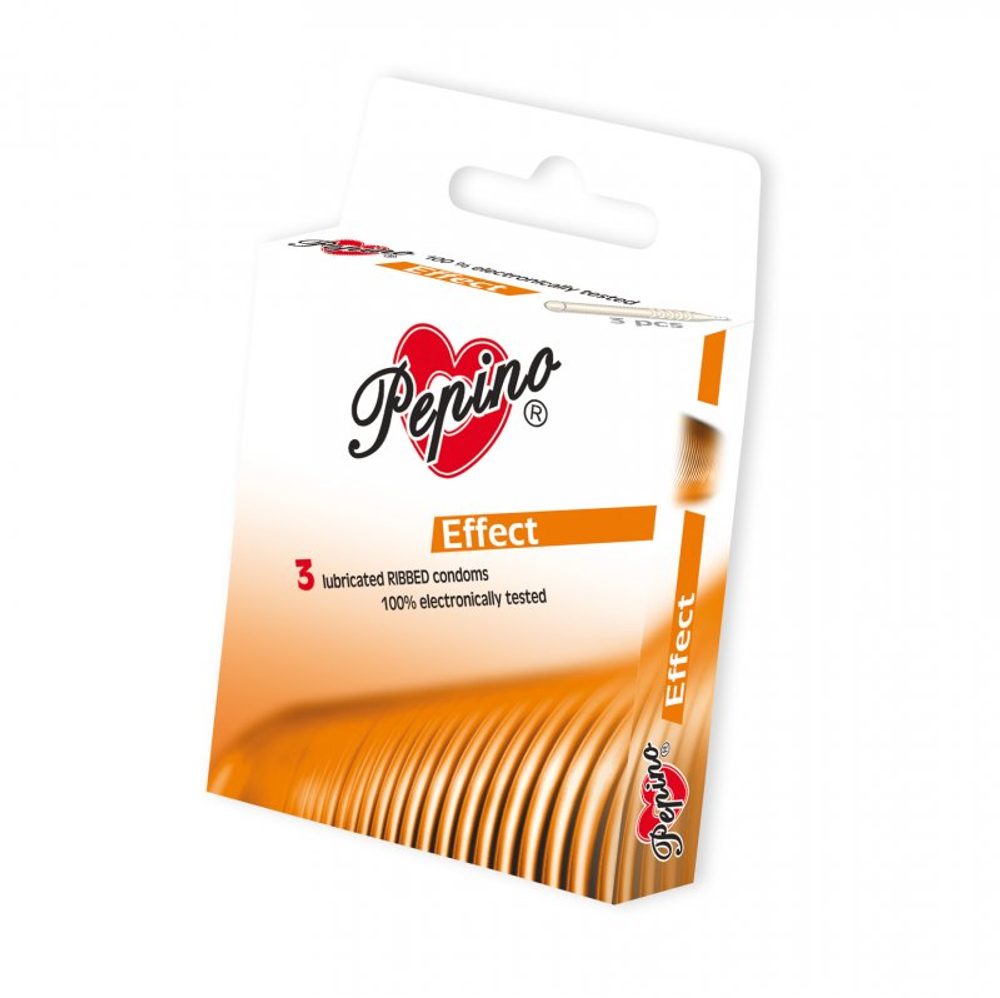 Pepíno Effect jsou kondomy z přírodního latexového materiálu. Povrch kondomů je zvrásněn pro větší dráždivý účinek. Kondomy jsou lubrikovány lubrikačním gelem na silikonové bázi a jsou 100% elektronicky testovány. Šířka 53 mm.